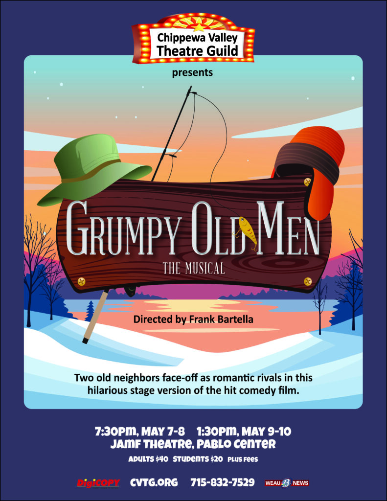 The Chippewa Valley Theatre Guild is proud to present the comedy Grumpy Old Men running May 7-10 at the Jamf Theatre, Pablo Center. GRUMPY OLD MEN is a hilarious and heartwarming story about two aging neighbors, Max and John, who have spent most of their lives locked in a feud. When a pretty, charming and eccentric woman named Ariel moves in across the street, both men find themselves vying for her attention, turning their rivalry into a full-blown comedic battle of wills. Based on the beloved film, GRUMPY OLD MEN is a delightful, funny and affectionate celebration of love, friendship, and second chances. 7:30pm, May 7 & 8 and 1:30pm, May 9 & 10 at The Pablo. Tickets to Grumpy Old Men
