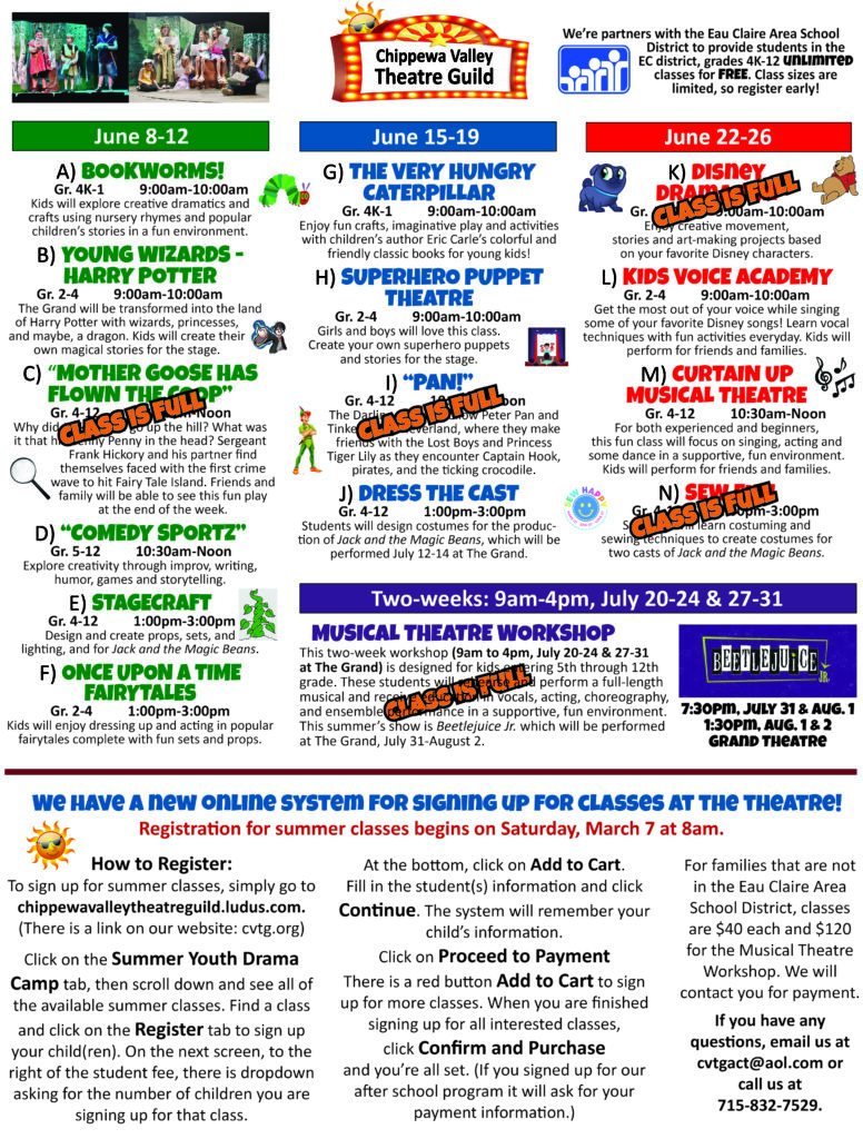 Registration: 8am, Saturday, March 7 for our fun summer classes! Go to: https://chippewavalleytheatreguild.ludus.com/index.php?sections=classes For questions, email us at cvtgact@aol.com or call us at 715-832-7529. SYDC Flyer 2026 CVTG Classes New Registration