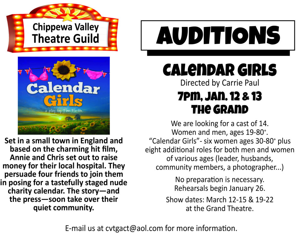 The Chippewa Valley Theatre Guild is seeking applications for their 2026 Carr Groenewold Scholarship Program. $1,200 in scholarship funds will be divided among one to three students and is awarded annually to a high school senior(s) pursuing music or theatre in college in the fall and/or a college student(s) continuing in music or theatre.